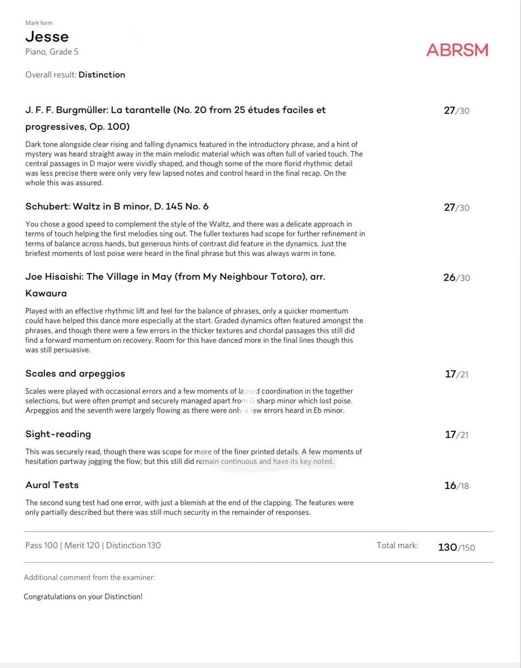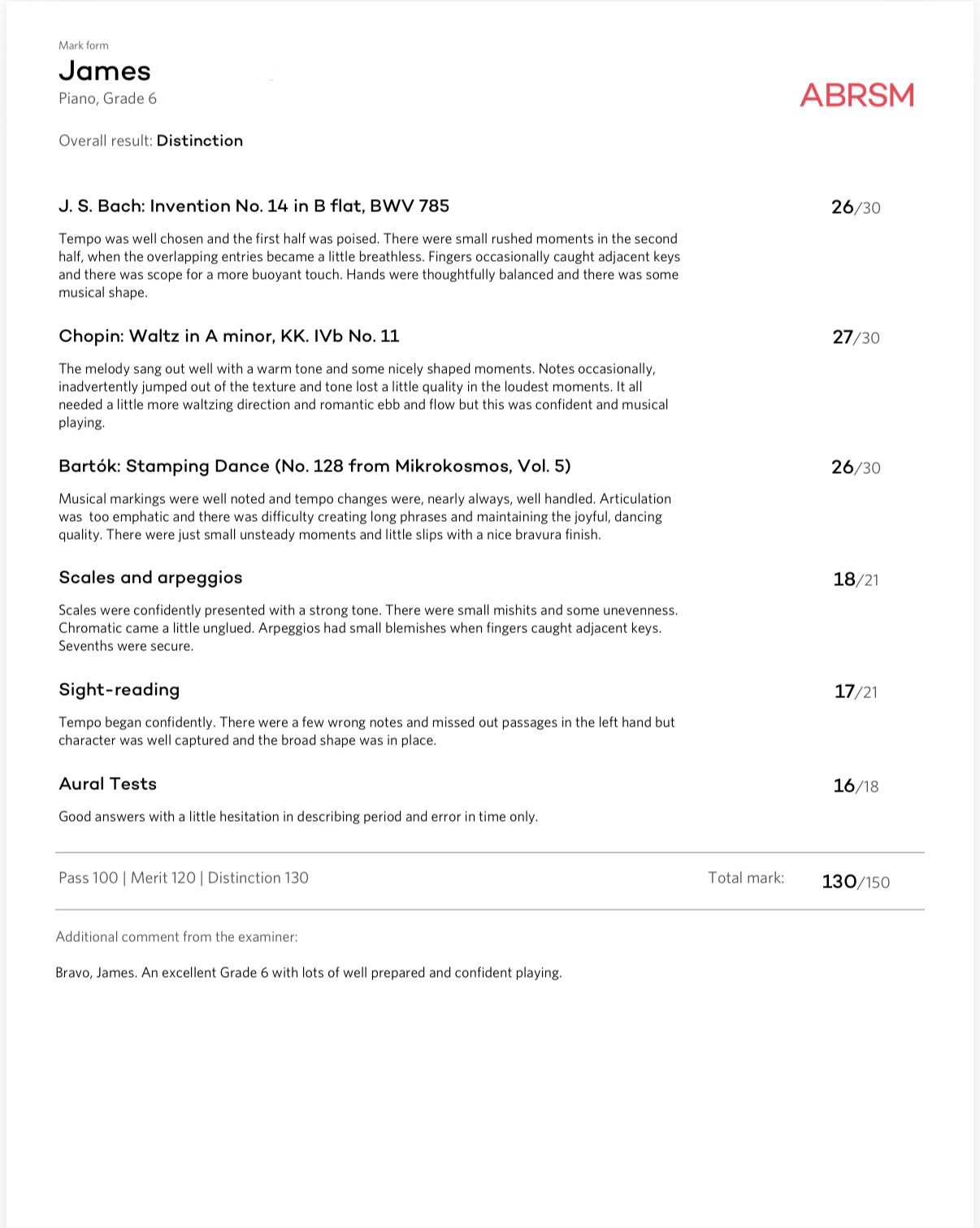 Scores out of 150: 100 to pass, 120 for Merit, 130 for Distinction.