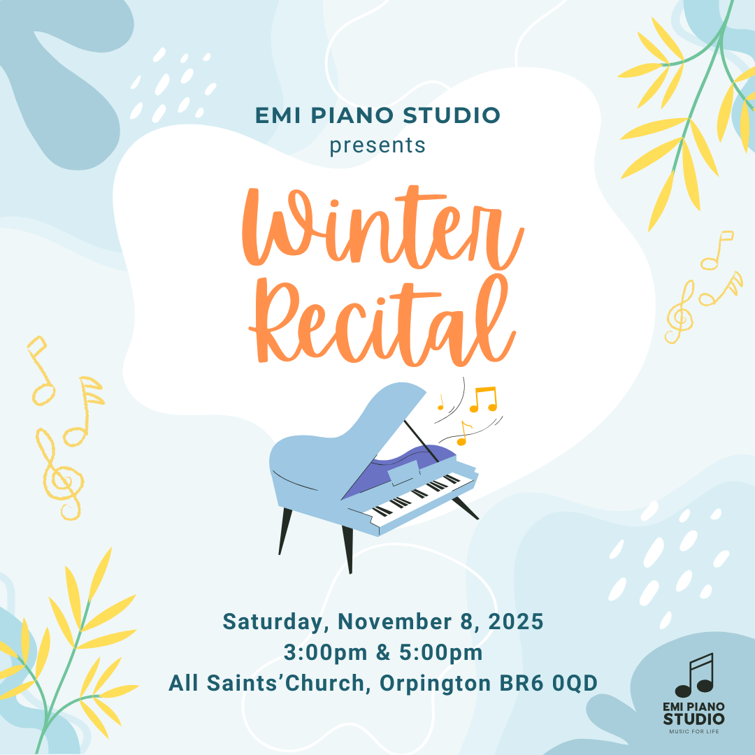 November 2024 - Emi Piano Studio hosted a successful Winter Recital, showcasing students' progress from children’s folk songs to classical pieces by Mozart, Beethoven, and Grieg. Performances included both solos and duets, reflecting their growth and dedication. Emi Piano Studio’s founder also performed Nessun Dorma by Puccini.